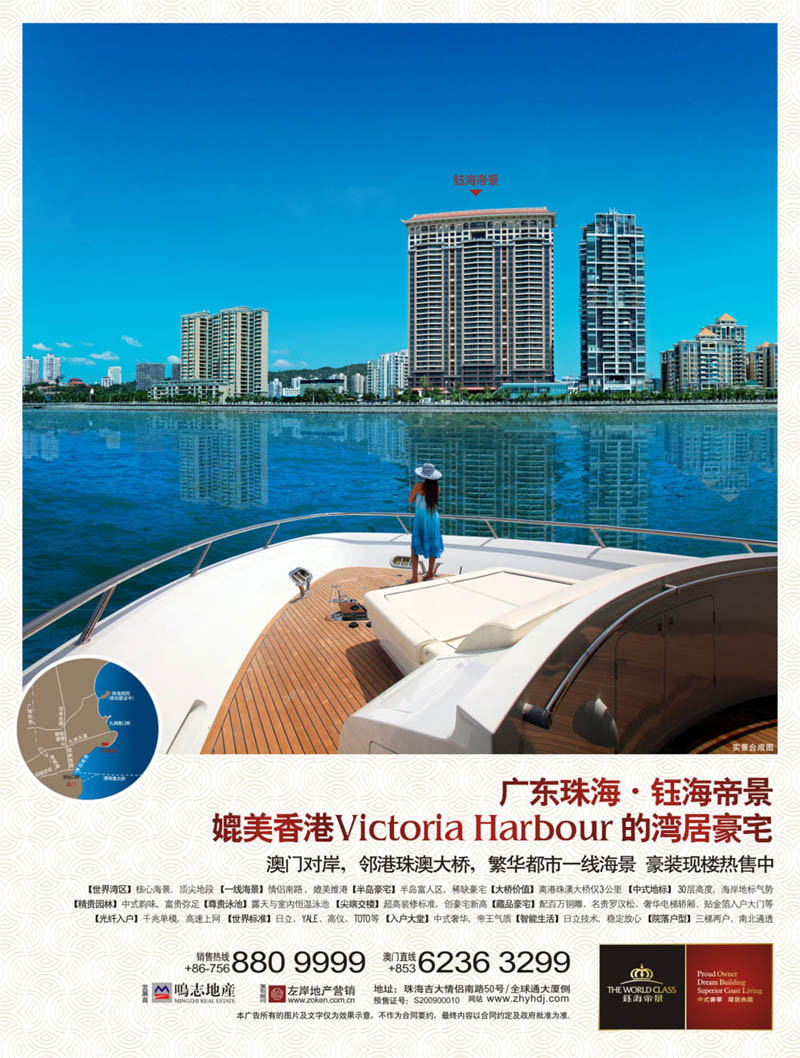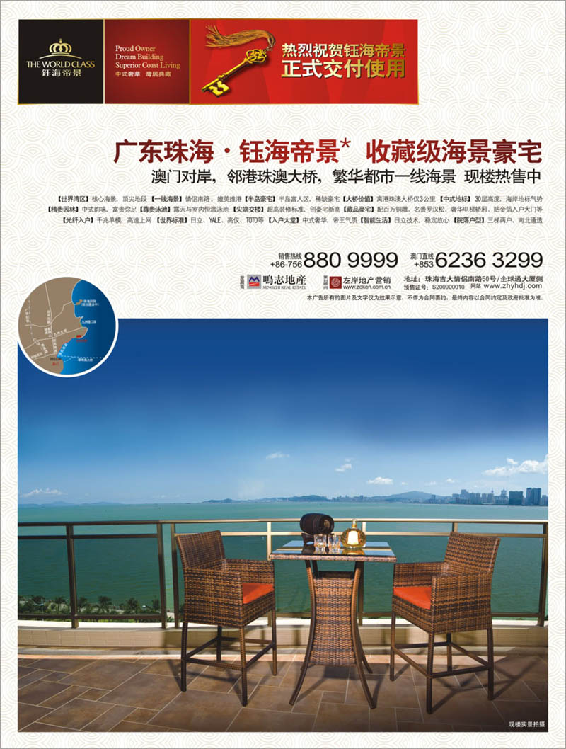 钰海帝景位于珠海情侣南路中,是珠海市区乃至全国海岸线上唯一的中式豪宅,珠海海岸线上最引人瞩目的地标性建筑。钰海帝景,以30层的雄姿,矗立在吉大交于拱北的半岛区位,这里海湾弧度大、海水蔚蓝、海天一色,与澳门对望,有绵延的青山美景,与大海间只有婀娜多姿的情侣南路,实为港珠澳核心的海景豪宅。
