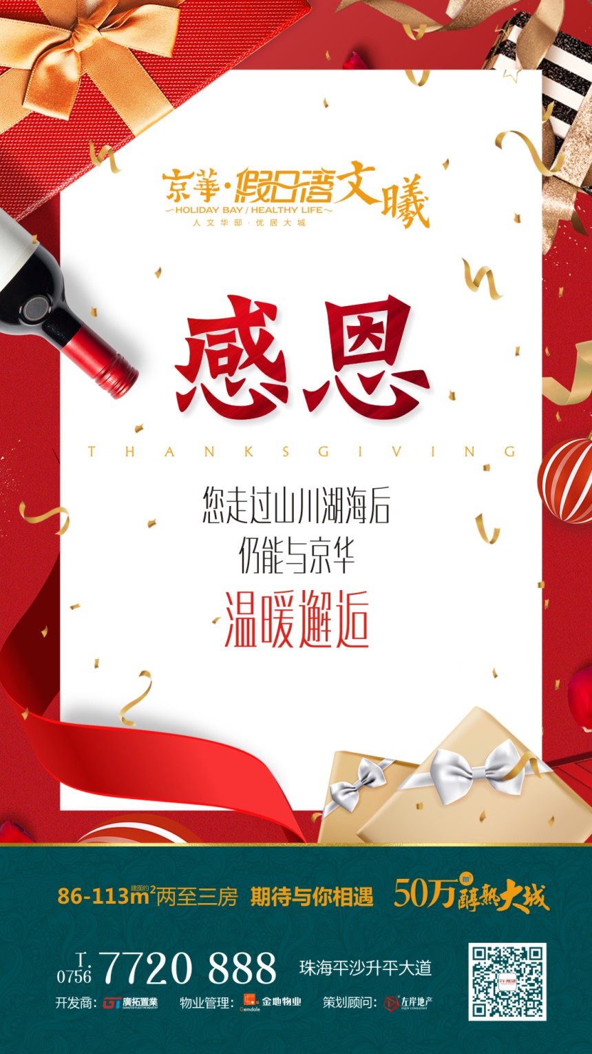 京华假日湾总建筑面积约50万㎡,分为A、B、C区开发建设,A、B区已交付,C区总建筑面积约32万㎡,自身配套双幼儿园、建面约2万㎡京华港都汇商业广场、建面超3万㎡特色商街、东南亚海滨度假园林及公共配套设施,充分满足业主多元的生活需求,将打造成为居住舒适、生活配套完善的全能宜居大城!